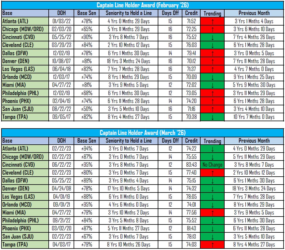 This data is calculated from the MARCH 2026 PBS awards. These junior line holders are crew members who are determined to hold a line with no training/vacation/FPL scheduled in their award month. Please note that many senior Captains also bid for reserve. The Average Line Value (ALV) varies monthly and can affect awards. Line awards are also affected by seasonal flying. The most junior award listed in the table is for a line with more than 70 hours, and seniority is based on overall seniority as of the base and effective date of March 1, 2026. Several crew members junior to the above line holder may have been awarded a line with fewer than 70 hours due to the lower ALV.
