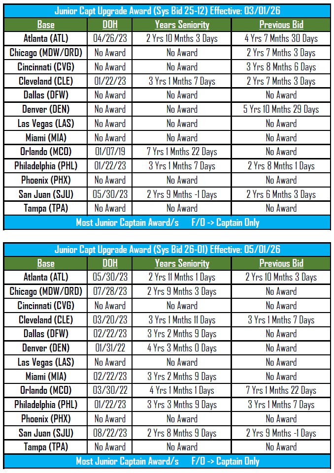 Most Junior Captain Line Holder = 2 Years 10 Months in ATL, CLE, ORD, SJU