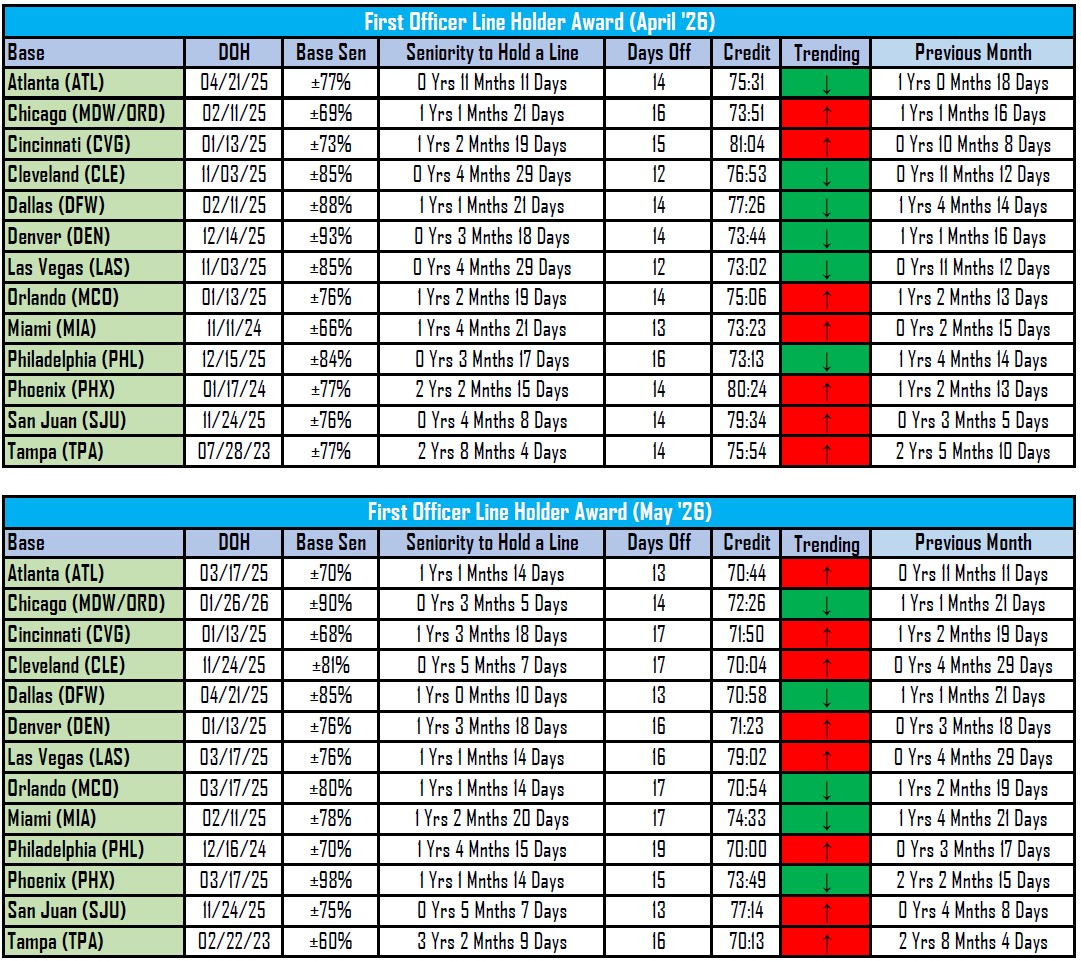 This data is calculated from the MAY 2026 PBS awards. These junior line holders are crew members who are determined to hold a line with no training/vacation/FPL scheduled in their award month. Please note that many senior First Officers also bid for reserve/FDO. The Average Line Value (ALV) varies monthly and can affect awards. Line awards are also affected by seasonal flying. The most junior award listed in this table is for a line with above 70 hours, and seniority is based on overall seniority in base and effective date of 05/01/2026. Lines could be lower with the company providing MMG for those awarded below 75 hours due to reduced block hours.